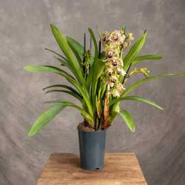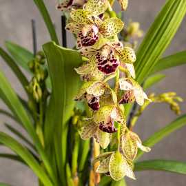 Cymbidium 'Vogel's Magic' to zachwycający storczyk, który wyróżnia się dużymi, intensywnie kolorowymi kwiatami w odcieniach zieleni, różu, bieli z bordowymi, nieregularnymi plamkami. Jego elegancka, rozłożysta forma i długotrwałe kwitnienie sprawiają, że jest to roślina, która przyciąga wzrok i zyskuje na popularności.