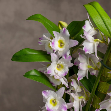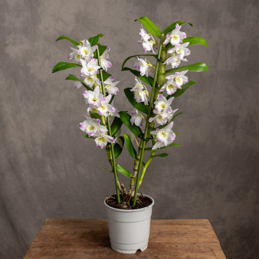 Dendrobium nobile ‘Spring Dream’ to wyjątkowo efektowna odmiana storczyka, która zachwyca obfitością kwitnienia i subtelnym, wiosennym urokiem. Jego pędy są gęsto obsypane kwiatami o delikatnych barwach- biało-różowych. Każdy kwiat wygląda jak drobny klejnot, a ich liczba potrafi całkowicie pokryć łodygę, tworząc widowiskowy efekt.