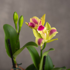 Storczyk Cattleya ‘Kaleidoscope’ to niezwykle efektowna hybryda, znana ze swoich dużych, pachnących kwiatów o intensywnych, wielobarwnych płatkach. Odmiana ta zachwyca grą kolorów-odcienie różu, purpury, żółci i pomarańczu przenikają się niczym w kalejdoskopie, tworząc unikalne wzory na każdym kwiecie. Roślina emanuje egzotycznym urokiem i elegancją, będąc prawdziwą ozdobą każdej kolekcji storczyków.