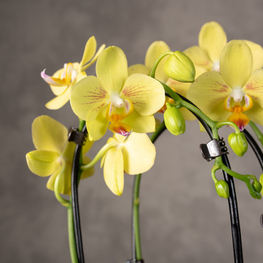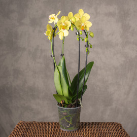 Phalaenopsis 'Manta Palau' to wyjątkowa odmiana storczyka z serii Manta More, wyróżniająca się intensywnie ciepłą, żółtą barwą z różową poświatą, Przypominającą rafy koralowe. Charakteryzuje się dużymi kwiatami, wysoką trwałością kwitnienia i kompaktową budową, co czyni ją efektowną dekoracją wnętrz.