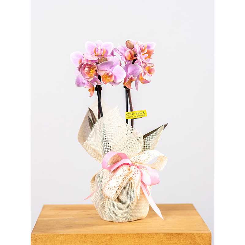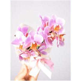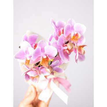 Storczyk miniaturowy mix kolorów udekorowany przez florystę. Cena zawiera zestaw: roślina + przybranie. Zdjęcie jest poglądowe, do kompozycji może zostać dobrany storczyk o innym kolorze kwiatów.