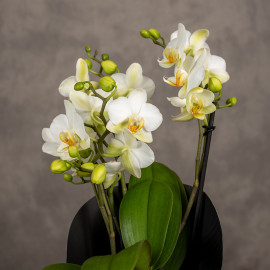 Storczyk Phalaenopsis Multiflora ‘Lausanne’ to elegancka odmiana o niezwykle subtelnym, a zarazem efektownym wyglądzie. Jej liczne, drobne kwiaty w odcieniach kremowej bieli z delikatnym, żółtym środkiem tworzą lekką, romantyczną kompozycję, która wygląda niczym kwitnąca chmurka.