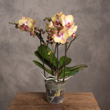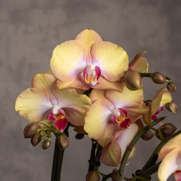 Phalaenopsis ‘MyMonro Glamour’ to wyjątkowa odmiana storczyka, która urzeka elegancją i subtelnym blaskiem. Jej kwiaty mają delikatny, kremoworóżowy odcień z lekko połyskującymi płatkami i kontrastującym, malinowo-różowym środkiem.