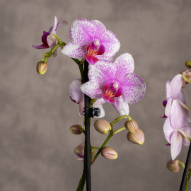 Phalaenopsis 'Rotterdam' to elegancka odmiana storczyka, która zachwyca intensywną barwą i klasycznym wdziękiem. Jej charakterystyczne, trwałe kwiaty mają głęboki, różowo-biały kolor i nakrapiany wzór. Kwitnie długo i obficie - pojedynczy pęd potrafi utrzymać kwiaty nawet przez kilka miesięcy, a przy odpowiedniej pielęgnacji storczyk może zakwitać kilka razy w roku.