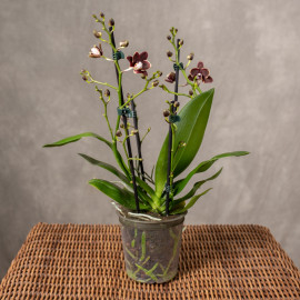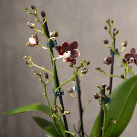 Phalaenopsis 'Taisuco Kobold' to niezwykle efektowna odmiana storczyka, która zachwyca intensywną kolorystyką kwiatów. Płatki mają głębokie, nasycone barwy – od purpury i fioletu po róż z kontrastującymi wzorami, co sprawia, że roślina staje się mocnym akcentem dekoracyjnym w każdym wnętrzu.