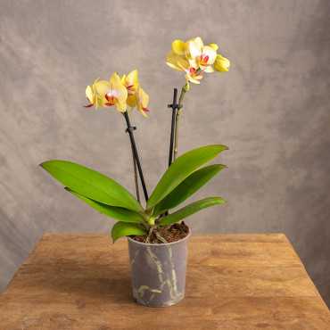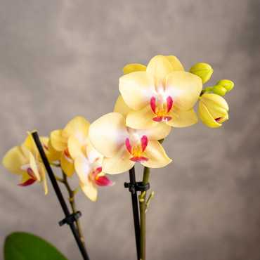 Niezwykle ozdobna odmiana popularnego storczyka, która wyróżnia się żółtym kolorem płatków z różowym środkiem.