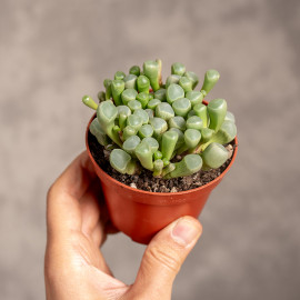 Fenestraria rhopalophylla - znana także jako „baby toes”, to sukulent pochodzący z południowo-zachodniej Afryki, który wyróżnia się wyjątkowym wyglądem. Roślina ta tworzy małe, cylindryczne liście, które przypominają palce, a ich końcówki są przezroczyste, co pozwala światłu docierać głębiej do wnętrza rośliny – to adaptacja do życia w ekstremalnych, pustynnych warunkach. Roślina rośnie nisko, w zwartym układzie. Fenestraria rhopalophylla jest idealna dla miłośników sukulentów, ceniących egzotyczne, nietypowe formy roślin.