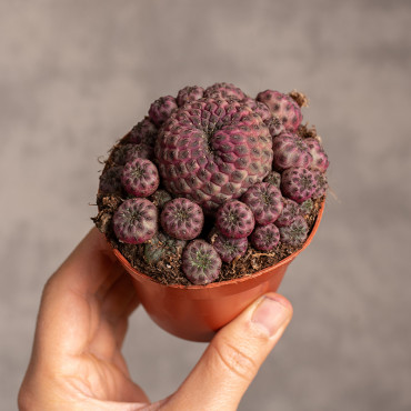 Sulcorebutia rauschii to niezwykły, kolekcjonerski kaktus o urzekającym, geometrycznym pokroju i unikalnym zabarwieniu. Jego niewielkie, kuliste segmenty tworzą gęste, symetryczne skupiska, a skóra rośliny mieni się odcieniami zieleni, fioletu, purpury, a czasem nawet srebrzystego różu- w zależności od światła i warunków uprawy. W okresie kwitnienia Sulcorebutia rauschii zachwyca intensywnie różowymi lub purpurowymi kwiatami, które tworzą piękny kontrast z kolczastymi, barwnymi pędami.