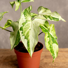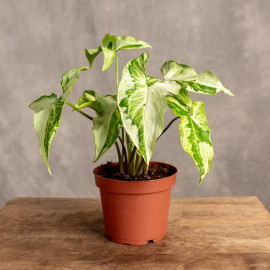 Syngonium 'Three Kings' to wyjątkowa odmiana zachwycająca swoich miłośników unikalnymi liśćmi, które wyglądają jak małe dzieła sztuki. Każdy liść jest ozdobiony nieregularnymi jasnymi plamami, które kontrastują z głęboką zielenią, nadając roślinie królewski charakter. Dzięki swoim oryginalnym wzorom, 'Three Kings' doskonale wpasowuje się w każde wnętrze, dodając mu elegancji i świeżości