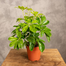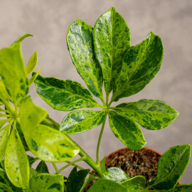 Charakterystyczne, dłoniasto rozłożone liście szeflery 'Anna' przyciągają wzrok niczym artystyczny detal. Składają się z wąskich, lancetowatych listków, ozdobionych nieregularnymi, ciemnozielonymi plamkami. To właśnie unikatowe, nakrapiane ubarwienie wyróżnia 'Anna' spośród klasycznych odmian szeflery. Możesz z łatwością utrzymać jej zwartą formę lub uformować ją w kształt miniaturowego drzewka z odkrytą łodygą.