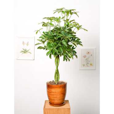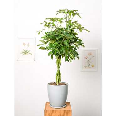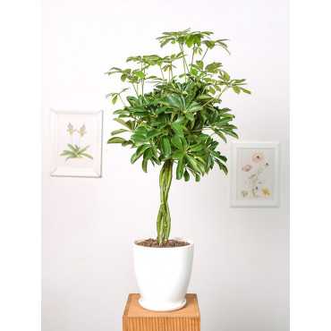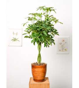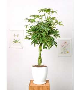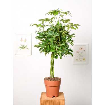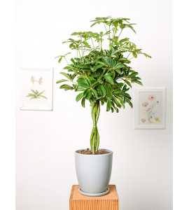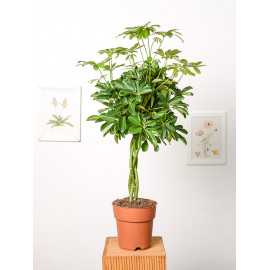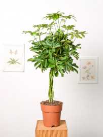 Szeflera to bardzo popularna roślina doniczkowa, odporna na zanieczyszczone powietrze, dym papierosowy, a nawet przeciągi. Jej parasolowate liście tworzą piękny pokrój. Szeflera na pniu będzie ciekawą ozdobą każdego domu, a także tarasu.