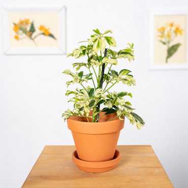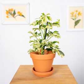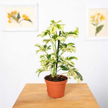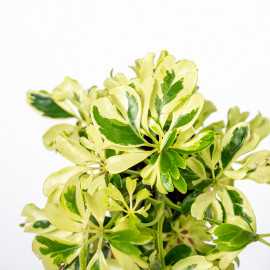 Szeflery są bardzo popularnymi roślinami doniczkowymi. Szeflera 'Janine' to miniaturowa odmiana o zwartym przekroju, która osiąga do 50 cm wysokości. Ma pięknie wybarwione liście w odcieniach żółci, kremu i limonkowej zieleni, które urzekają swoim wyglądem. Niejednolite, wręcz pstrokate ubarwienie jest niezwykle atrakcyjne dla oka. Całość dopełniają parasolowate liście.