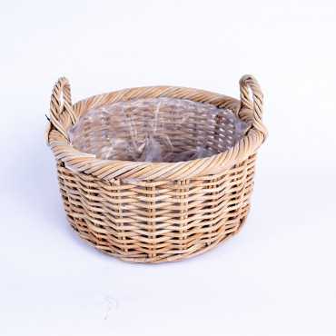 Kosz pleciony w odcieniu jasnego brązu. W środku posiada folie zabezpieczającą przez zabrudzeniem czy zalaniem.