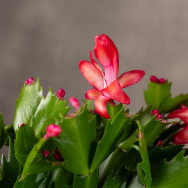 Schlumbergera truncata 'Flame Red' to efektowna odmiana grudnika, wyróżniająca się intensywnie czerwonymi, ognistymi kwiatami o dynamicznym, płomiennym kształcie. Jej segmentowane pędy są jasnozielone i delikatnie ząbkowane, co nadaje roślinie lekkości i elegancji. Kwitnie obficie późną jesienią i zimą, wprowadzając do wnętrz żywe kolory, kiedy większość roślin odpoczywa. Jest łatwa w uprawie - lubi jasne, rozproszone światło, umiarkowane podlewanie i lekko wilgotne, przepuszczalne podłoże.