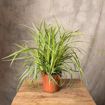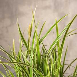 Acorus gramineus 'Variegatus' (tatarak trawiasty) to ozdobna bylina bagienna o eleganckich, wąskich liściach, które mają zielono-żółte, pasmowe zabarwienie. Liście są długie, wąskie i przypominają trawy, co sprawia, że roślina ma subtelny, lekki wygląd. Tatarak trawiasty kwitnie latem, wytwarzając niepozorne, żółtawozielone kwiaty na krótkich, pionowych pędach.