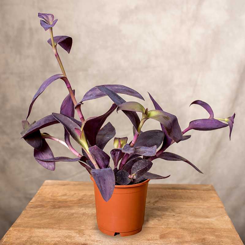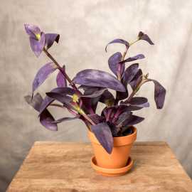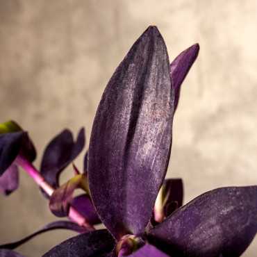 Trzykrotka purpurowa to roślina o niezwykłych, ciemno fioletowych liściach. Jest pnączem i w miarę wzrostu jej pędy zaczynają przewieszać się i tworzyć piękną kaskadę. Pędy mogą osiągać do 40 cm długości. Jak wszystkie trzykrotki jest prosta w uprawie i nie wymaga specjalnej pielęgnacji. Starsze okazy dobrze prezentują się w wiszących pojemnikach lub makramach.