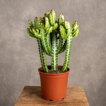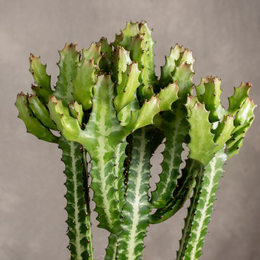 Wilczomlecz mleczny (Euphorbia lactea) to fascynująca roślina o egzotycznym wyglądzie, która wyróżnia się swoimi efektownymi, rozgałęzionymi pędami. Posiada pionowe, mięsiste łodygi z wyraźnymi, żebrowanymi krawędziami, często z delikatnym, szaro-zielonym odcieniem, które mogą być ozdobione kremowymi wzorami. Jego nietypowy kształt przypomina krzew, co sprawia, że roślina ta przyciąga uwagę i jest doskonałym dodatkiem do nowoczesnych aranżacji wnętrz.
