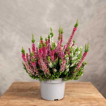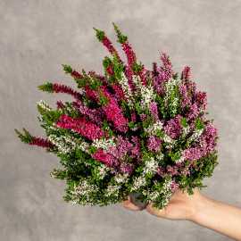 Wrzos 'Beauty Ladies' to wyjątkowa kompozycja trzech odmian wrzosów o intensywnych barwach, które tworzą piękne, wielokolorowe zestawienie. Idealny na balkon, taras czy ogród.