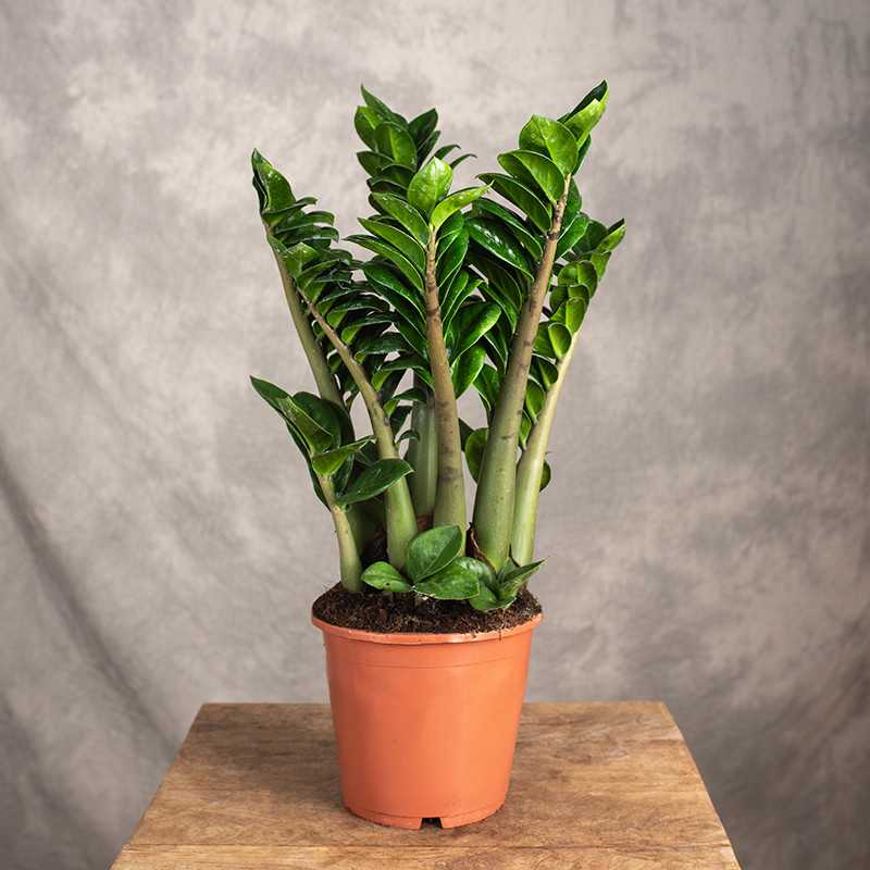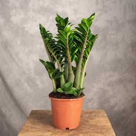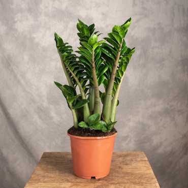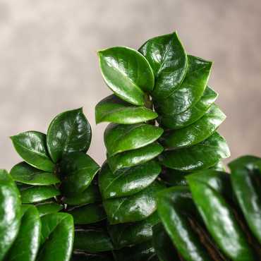 Zamiokulkas 'Zenzi' to kompaktowa odmiana popularnego zamiokulkasa. Ma silnie skrócone i grubsze pędy oraz gęsto ułożone liście. Tworzy zwarty pokrój i jest wyjątkowo łatwy w uprawie. Idealny dla początkujących.