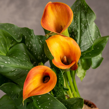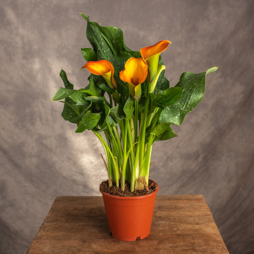 Zantedeschia znana również jako kallia, to efektowna roślina o intensywnie pomarańczowych, lekko błyszczących kwiatach, które przyciągają wzrok ciepłym, energetycznym kolorem. Lejkowate kwiaty wznoszą się ponad zielone liście, często pokryte delikatnymi, białymi cętkami. Dorasta do około 40–60 cm wysokości. Doskonale sprawdza się zarówno w ogrodach, jak i w donicach na balkonach czy tarasach.
