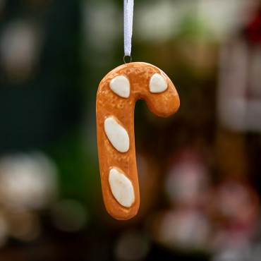 Ozdoba choinkowa w kształcie laski z piernika. Wykonana z ceramiki, szkliwiona.