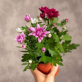 Chryzantema ( Złocień ) to wieloletnia roślina z rodziny Astrowatych. W Japonii jest to kwiat narodowy. Ich pokrój jest wzniesiony i krzaczasty. Znakiem rozpoznawczym tych roślin są bardzo charakterystyczne, pierzasto powcinane liście. W zależności od gatunku, kwiaty chryzantem mogą różnić się zarówno wielkością, jak i kształtem oraz kolorem. Występują kwiatostany kuliste, półkuliste, parasolowate, igiełkowe czy pomponowe. Chryzantema znalazła się również w badaniach Clean Air Study prowadzoną przez NASA, uznaję się ją za roślinę oczyszczającą powietrze.